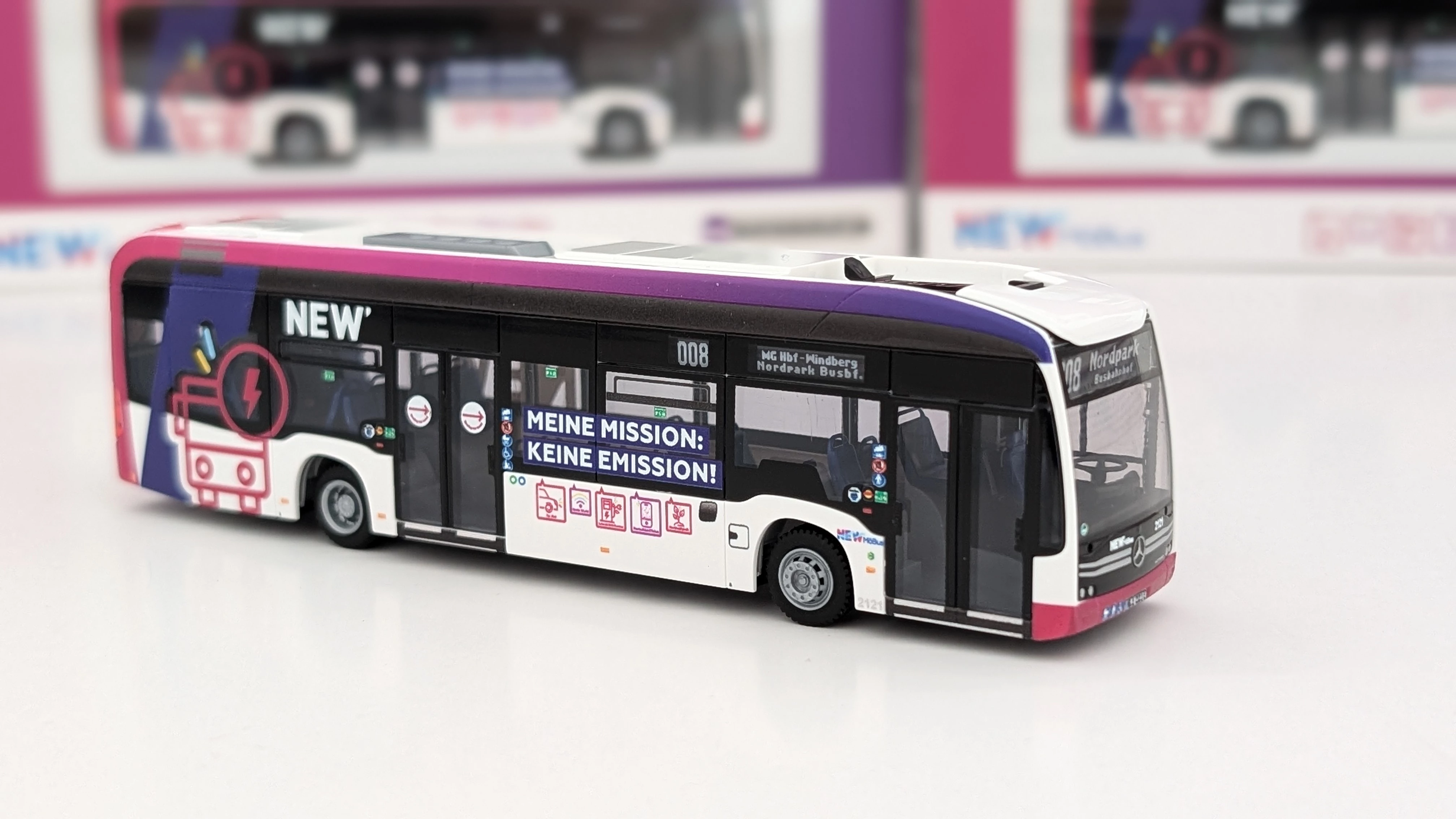 Allgemeine Informationen zum Produkt: Der Modellbus wird im Maßstab 1:87 gefertigt. Die beiliegenden Zurüstteile, wie Scheibenwischer oder Spiegel, sind separat beigepackt und müssen mit einem speziellen Kleber (nicht im Lieferumfang enthalten) angebracht werden. Aufgrund der filigranen Verarbeitung ist das Modell für Personen erst ab einem Alter von 14 Jahren geeignet.
